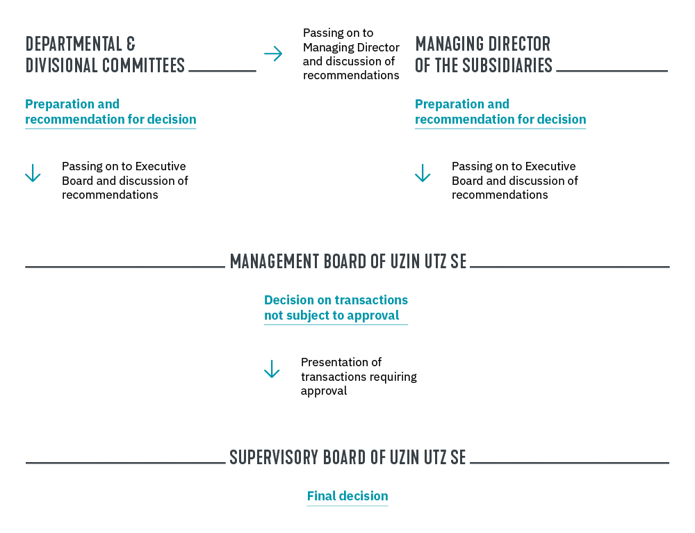 The internal Group organisation is based on direct decision-making channels and the flattest possible hierarchies. The decision-making process of the Uzin Utz Group is illustrated in the following diagram.